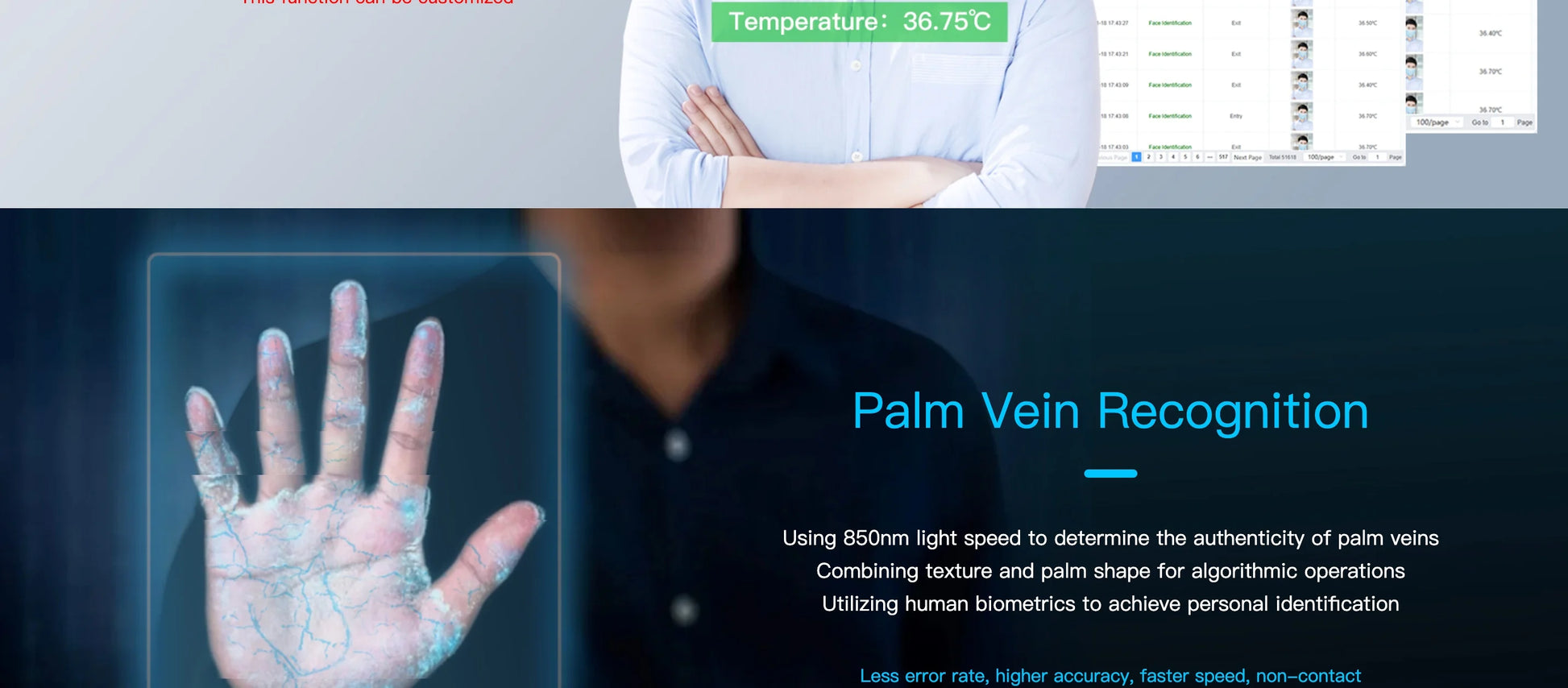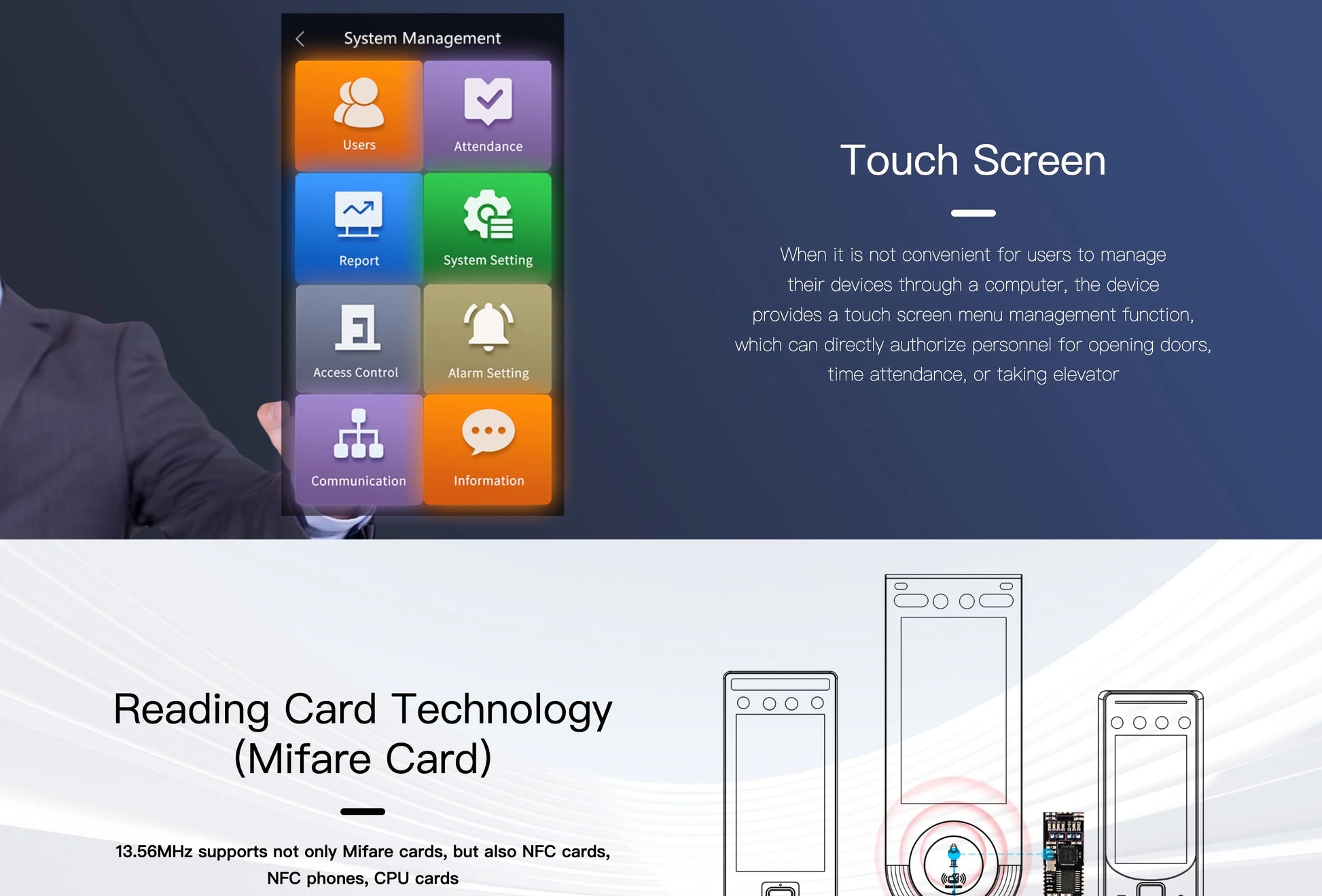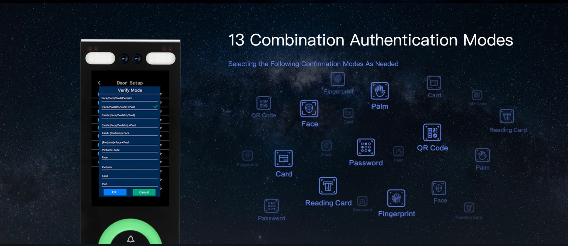 Recognition Mode: Face, Palms, Password, Mifare Card, Dual-frequency Card Optional