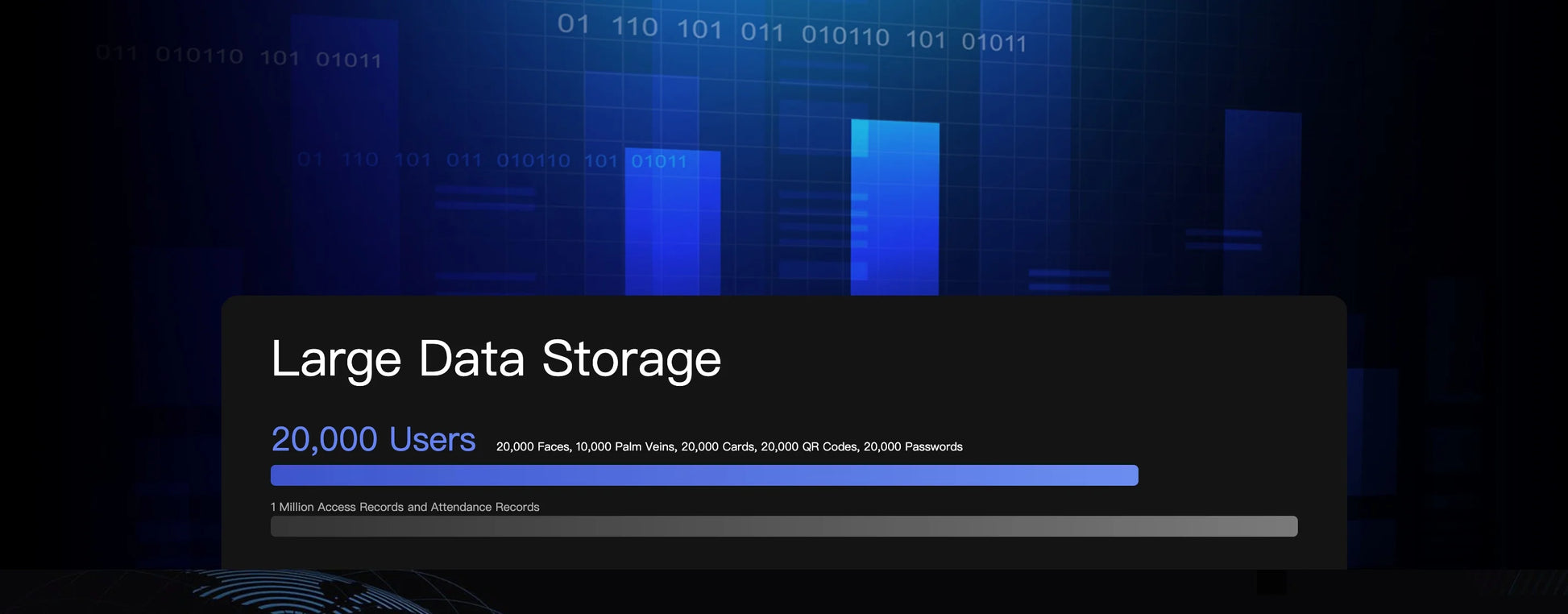User Capacity: 5000,20K Users, 20K Faces, 20K QR Codes, 20K Cards, 20K Password, 10K Palms